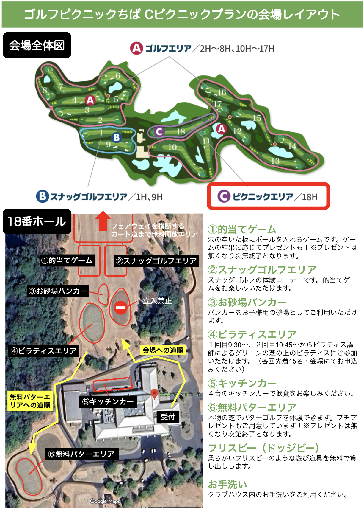 A ゴルフ体験プラン(先着27組限定):1組7,000円 追加1名につき+2,000円(1組最大4名まで) B スナッグゴルフプラン(先着18組限定):1組5,000円 追加1名につき+2,000円(1組最大4名まで) C ピクニックプラン:無料 |